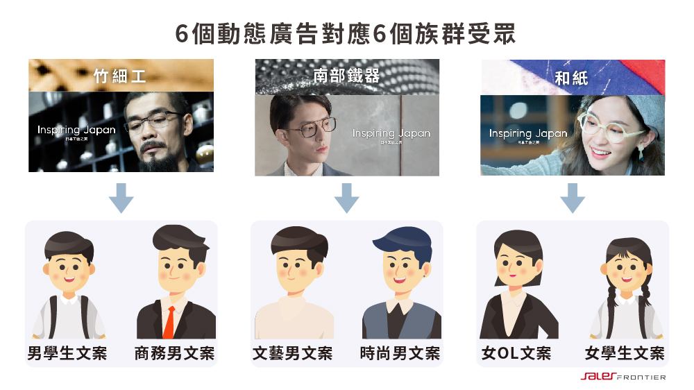 針對「Inspiring Japan 日本工藝之美系列」新品引進,利用動態素材投遞廣告(Data Driven Creative,DDC)快速測試市場反應,讓潛在消費者看到適合自己的推薦商品,提升購買慾望。除了針對產品定位希望主打的族群,快速測試分眾是否正確之外,在行動裝置上投遞影音素材可更強勢的吸引消費者目光,並反映測試族群的使用習慣。
