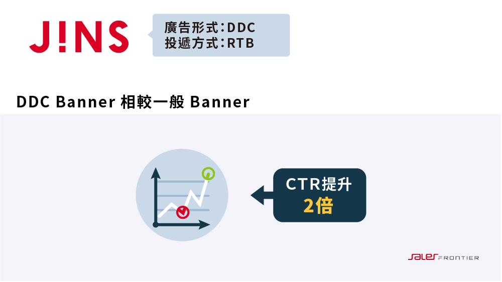 在 DDC(Data Driven Creative)遞送素材的過程中,成果行銷團隊並不針對單一的消費者人口特徵(例如:性別)進行遞送,而是在進行測試之後,依據不同情境遞送合適的客製化廣告給受眾。經過這樣的測試之後,J!NS 也獲得意料之外的數據洞察,在測試過後的市場回饋,最受歡迎的竹細工系列眼鏡,原本的消費者設定是以 40 歲至 50 歲的中年族群為主要對象,但在經過 DDC 動態資料素材廣告 Banner 的數據回饋之後,才發現學生族群、年輕男性是大宗消費者。測試結果的數據洞察也讓 J!NS 在產品設計及行銷策略上能更即時的調整與優化,甚至成為未來開拓市場新客源的重要參考。