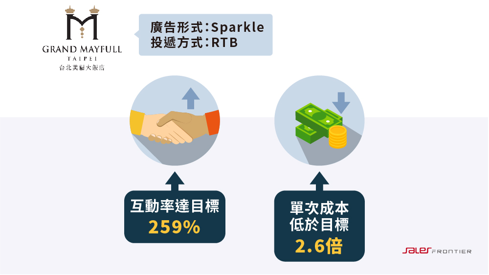 美福飯店為台灣知名五星級飯店,為提升國外旅客住房率、增加海外知名度,與成果行銷合作,於日本投放「Sparkle」廣告,藉由 「Sparkle」 展開之特性,搭配創意圖像素材,抓住消費者眼球,達到宣傳效果。於日本首波推廣成功後,海外遊客訂房率顯著提升,後續在韓國的宣傳策略中,也再次與成果行銷團隊合作,吸引韓國遊客來台灣訂房住宿。