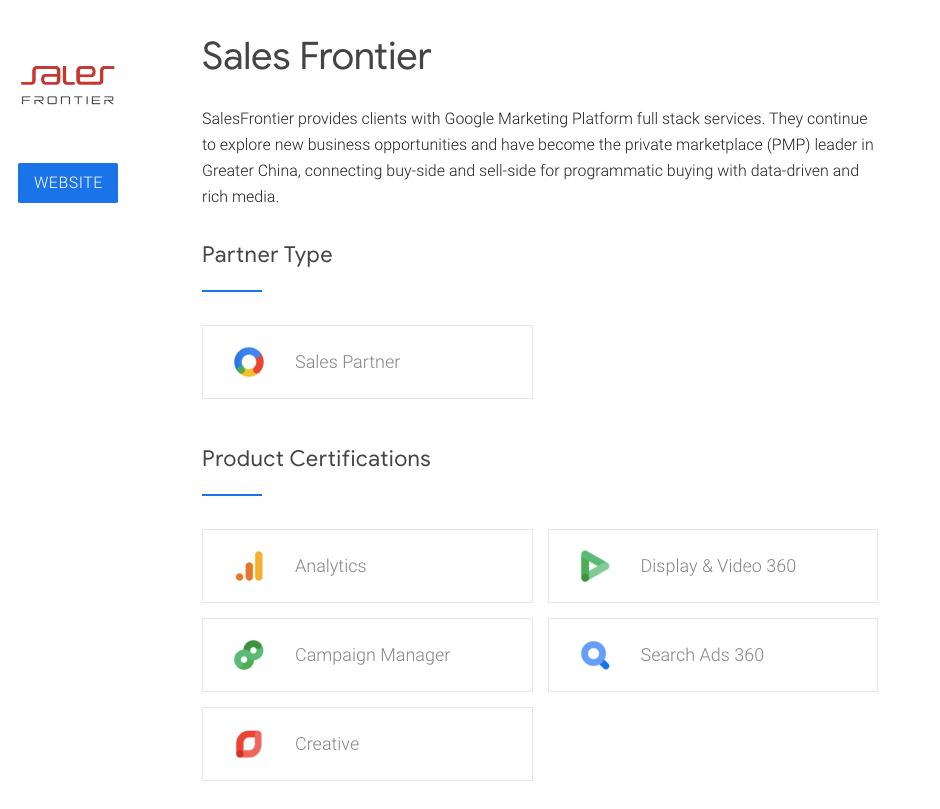 SalesFrontier 成果行銷於 2018 年成為 Google Marketing Platform Partner 亞太區合作夥伴,擁有多項 Google 廣告產品的專業認證,更於 2021 開春,再次榮獲 Google Analytics 官方認證,為值得信賴的數據分析團隊,能以專業洞察分析及技術,為客戶夥伴提供更完整的數據解決方案。