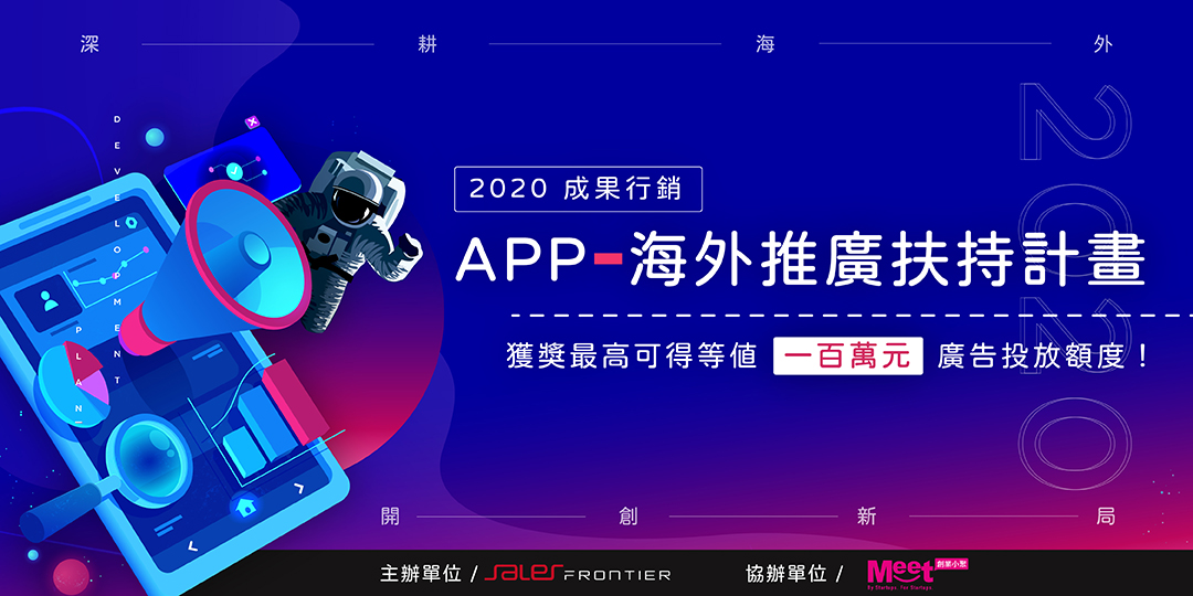 SalesFrontier 成果行銷因有感於許多台灣本土的 APP 開發團隊,雖擁有優質的內容產品,卻受限於大環境因素而無法快速擴展,進攻海外市場,而錯失良機,深感可惜,特地力邀台灣新創團隊的最佳推手 - Meet 創業小聚協辦「2020 成果 APP 海外推廣扶持計畫」,希望除了以成果行銷自身積累的經驗及 Google 等合作夥伴的資源彙整之外,更結合創業小聚的經驗洞察,幫助更多台灣中小型的 APP 開發團隊進攻海外,將這些充滿潛力的移動應用,推向國際舞台,盡情展現台灣的軟實力。本計畫除了提供高額海外推廣投放額度做為獎勵,更將以專業廣告技術與跨平台行銷資源,協助獲獎團隊全面提升海外廣告投放及流量變現成效,帶領他們開拓國際市場,讓產品從海外推廣、用戶成長,到流量變現,全面提升成效,穩定經營。