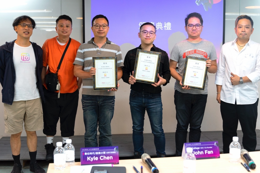 決選評審及前三名獲獎者大合照。(左起:PicCollage CEO / Co-founder John Fan、數位時代創業小聚社群行銷總監陳凱爾、第三名獲獎者「符文重生」、第一名獲獎者「美食優惠」、第二名獲獎者「Funliday」、成果行銷執行長陳建勳。)