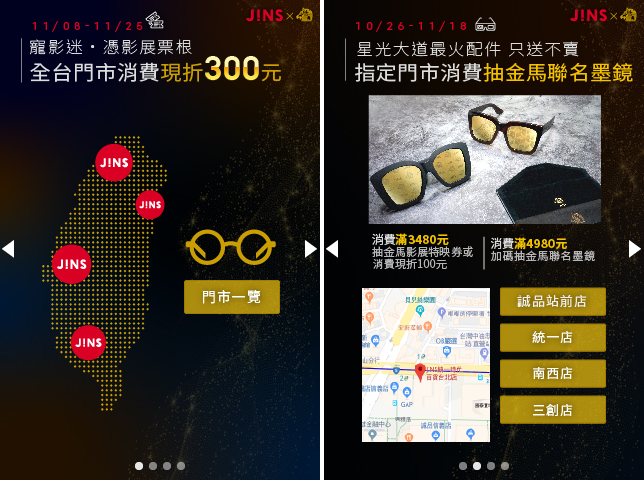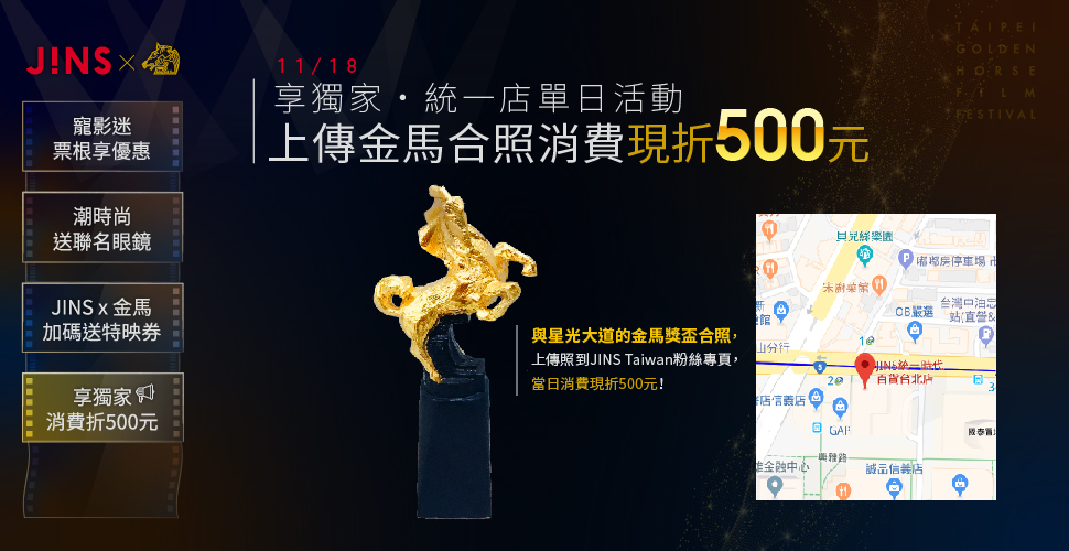 金馬獎是華語影壇歷史最悠久的電影獎項,2018 年 J!NS 與金馬影展推出限量聯名商品,在與成果行銷第一波 DDC 廣告策略的成功之後,這次特別使用「Sparkle」及「三折頁展開式廣告」來進行宣傳,創造兼具吸睛效果與豐富內容的創意廣告,有效提升品牌印象與商品購買率。